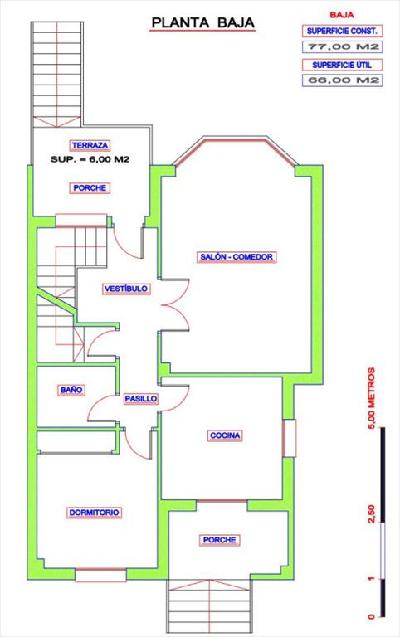 Planta baja porche en acceso a vivienda, y porche posterior con acceso a zona ajardinada, vestíbulo, salón-comedor, cocina amueblada, un dormitorio y un baño.
