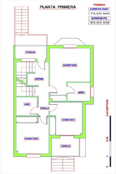 Planta primera terraza con acceso desde pasillo, tres dormitorios (uno de ellos con baño en suite y acceso a terraza).